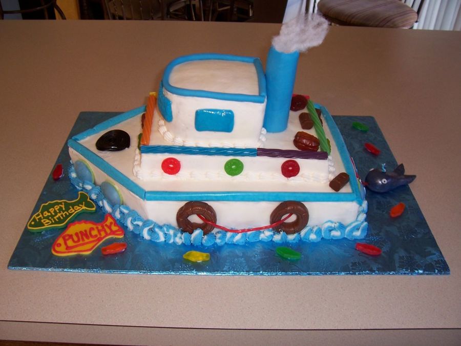 This is iced in buttercream with candy accents. The smoke stack is a plastic dowel covered in fondant and the "smoke" is cotton. TFL