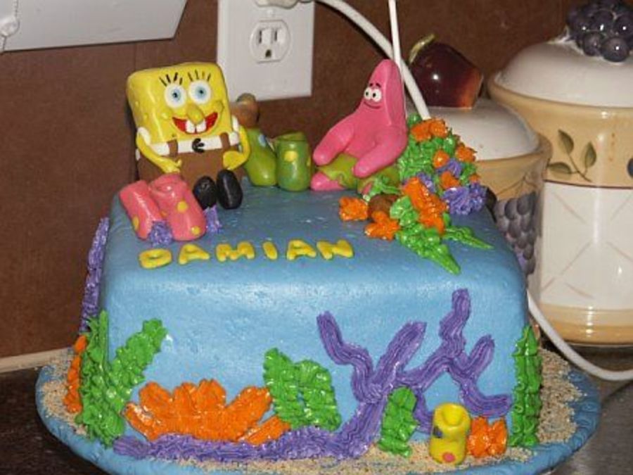 Made for a lady at work. French vanilla cake, strawbwrry filling, buttercream frosting, covered with MMF. The spongebob is a rice crispy treat covered in MMF, Patrick is all MMF. Buttercream accents. Thanks to Cake central for all the great idea's.