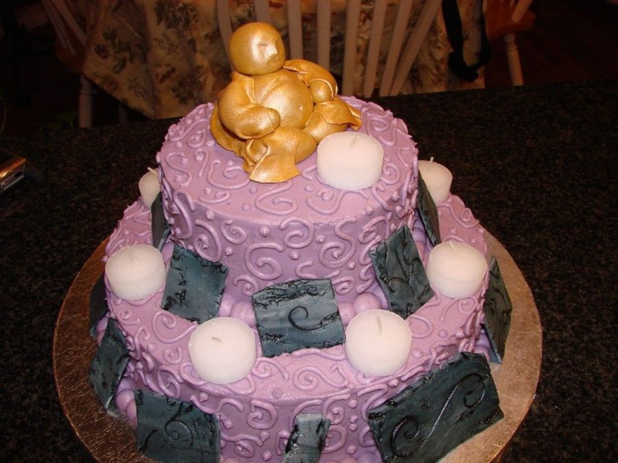 My sister and I love yoga so I call this our Namaste cake. It is a two tier cake with buttercream icing. I made the Budah out of fondant and after he dried for a day I painted him with three coats of gold luster dust made into a paint with vodka. The "ancient" stone tablets are also handmade from fondant.