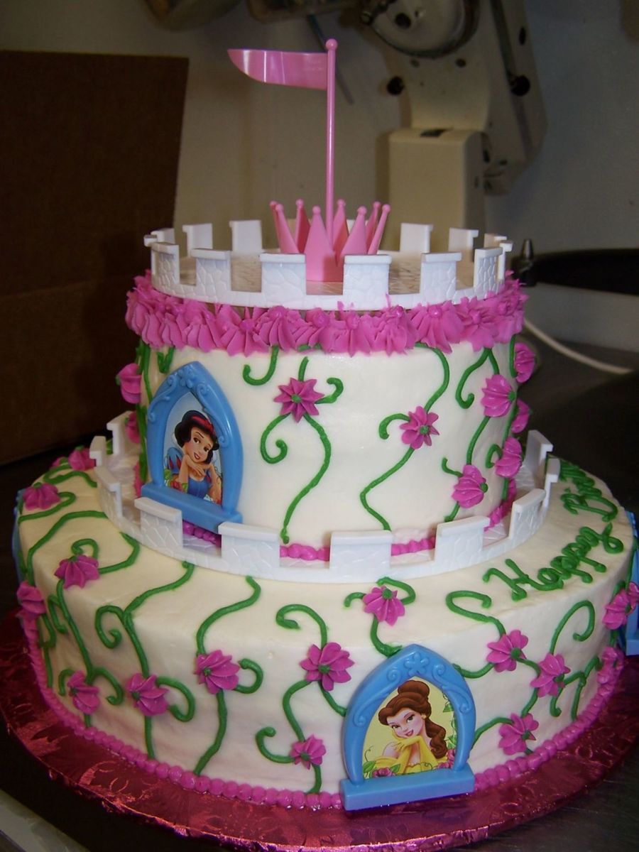 I put this together using the Disney princess castle kit. We got a picture of the birthday girl and actually covered one of the princesses' window with her. The birthday girl was part of the cake, too! Buttercream frosting.