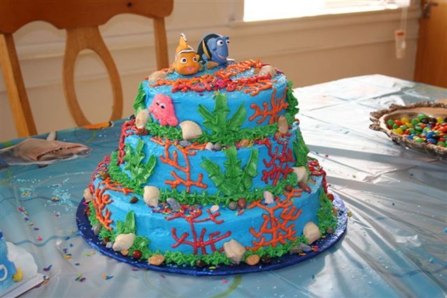 Three tiered cake. Nemo and Dory on top. Chocolate seashells.