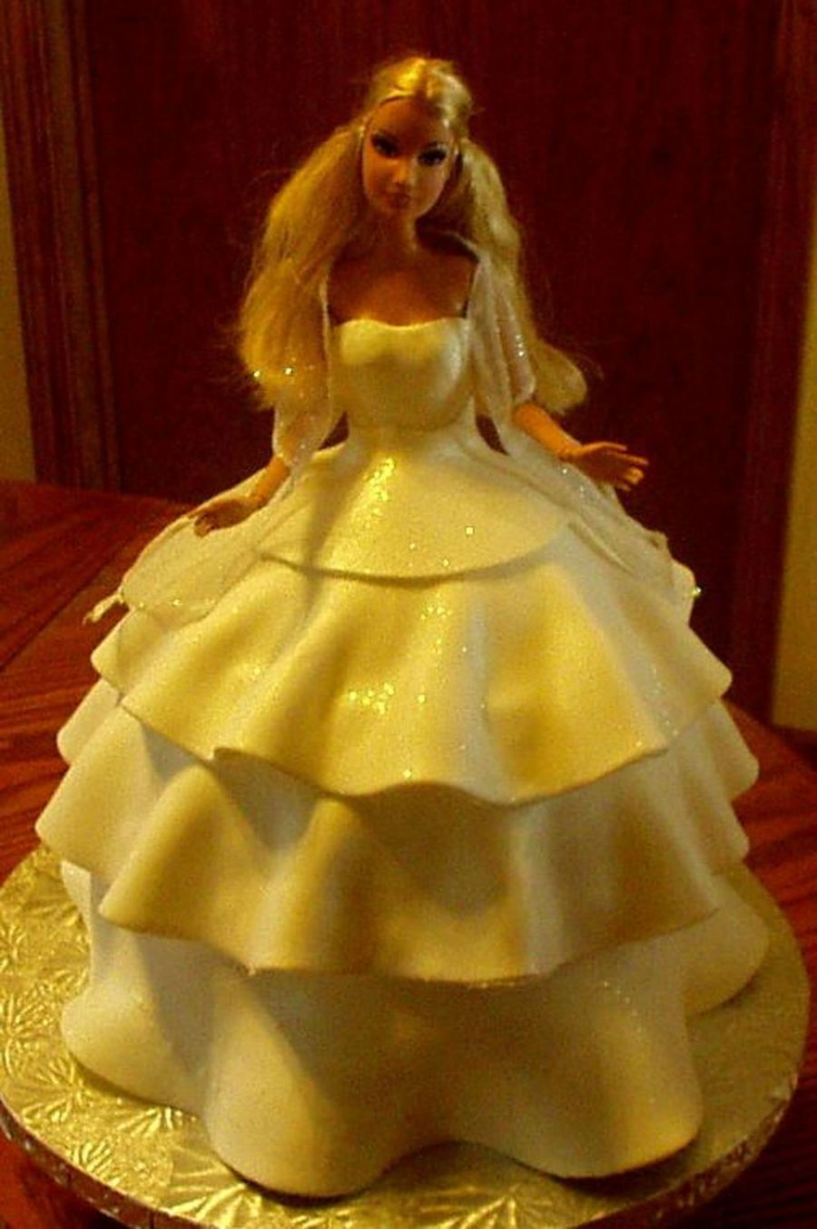 angies on 10 Mar 2008 , 11:16am I made the ruffles by using my fingers after the skirt was on the cake. As for the color, it is actually pure white. I had to darken the picture to take away the glare. Thank you.