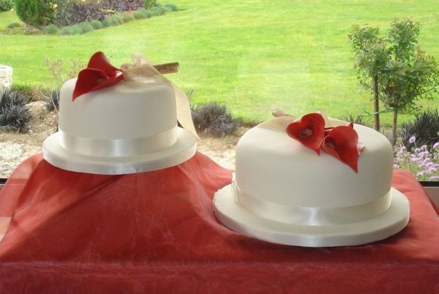 Fruit cakes covered in Ivory fondant with calla lilies made from sugarpaste. This was for a second time round wedding.