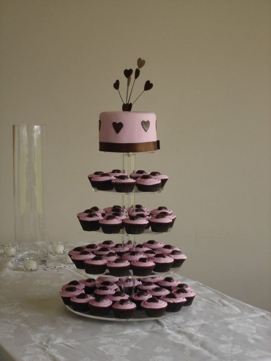Bride arrived with a picture of cake. Thank you to person whose idea it was. Mini mudcake cupcakes in brown cupcake cases and an 8" round cake on the top covered in pink fondant. Cup cake topped with pink icing and a heart shaped chocolate