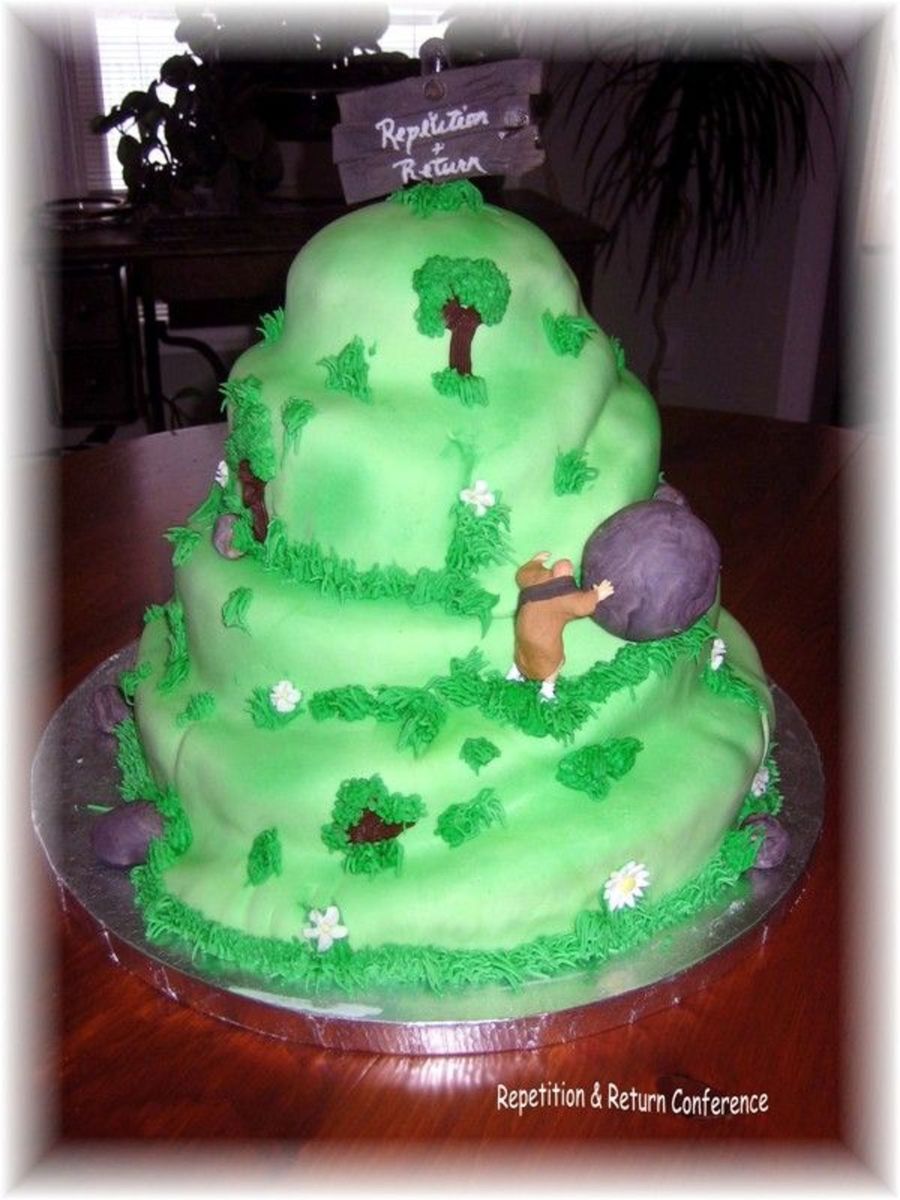 This cake was made for my daughter's conference at university. The name of the conference was Repetition & Return. This cake was made to resemble their logo which depicts the Myth of Sisyphus (he was destined to roll a rock uphill and watch it roll back and repeat the process throughout Eternity. This is a 12, 10, 8 and sports ball pan, carved. WASC on the bottom two layers, chocolate on top. (Special thanks to Doug who was very helpful with design ideas - I decided to go with rounds in the end to match their logo.)