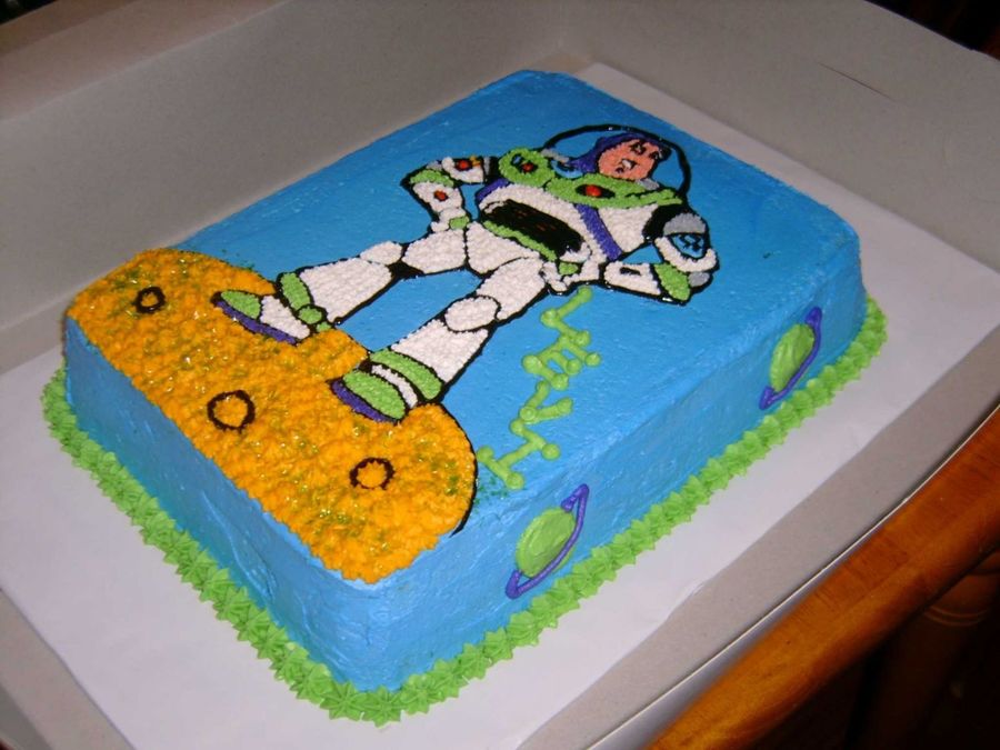 This was for a 4 year old's birthday. It is a funfetti cake fill with chocolate buttercream. It is iced in BC. The Buzz design is made with piping gel and filled with BC.
