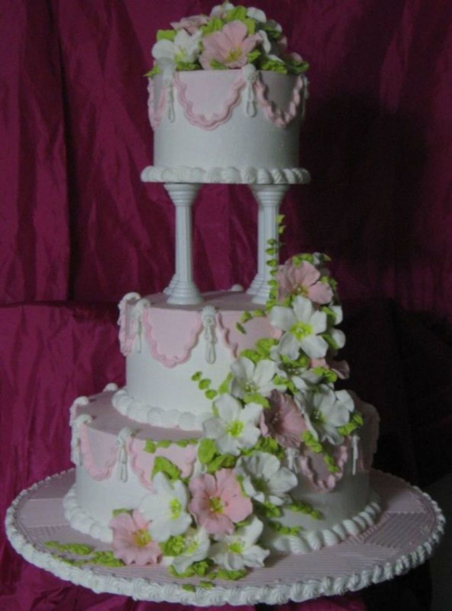 It's a dummy iced in royal with royal icing petunias. The base was also iced in royal then combed and a reverse shell border added to finish it off.. This is to represent some of the techniques learned up to and in Course III...petunias, outlining, reverse shell, drop strings, fondant beads, rosettes, leaves, stacked tiers as well as using the separator plates and pillar construction. Wedding season is fast approaching and wanted to do something really nice for the craft store window BEFORE it hits.
