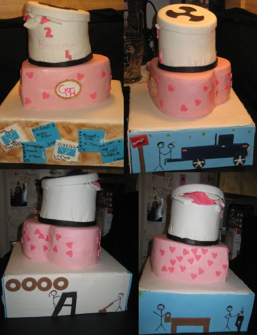 I made this cake for my anniversary as a surprise for my dh. The bottom tier is a dummy cake ALL decorations are mmf. The cake represents our life bottom tier is us dating, middle tier is our wedding, top tier is now . The middle tier the hearts that you see when you see the picnic below it my 4 year old daughter put them on. When you see the girl on the ladder on the bottom tier the hearts you see on the second tier my 3 year old son put on. The gold 'beads' are just white mmf covered in luster dust.