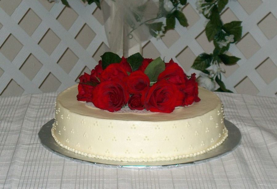 This cake was the wedding cake for one of our Elementary teachers. She and her fiance are both widowers, and didn't want anything extravagant. She requested a single tier cake in ivory, with red roses. It is a 14 inch round to feed 75.