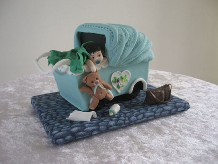 This is the first time I've seen a pram cake! Great idea. I love how the baby is holding the bear.