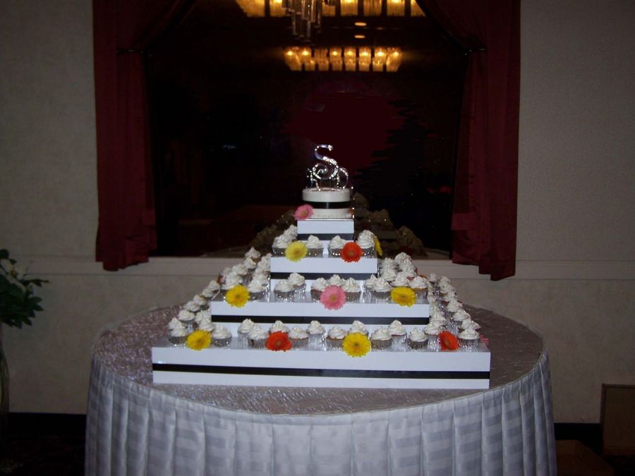 100 cupcakes in 6 different flavors and fillings all iced with the WHBH House Buttercream. 6" strawberry cake filled and iced with the House Buttercream as well. Fresh Gerbera Daisies decorated.