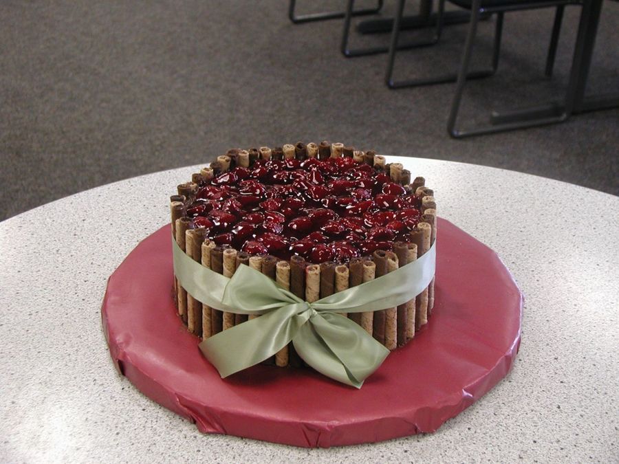 Chocolate W/ Strawberry filling , using Piroutte's to cover sides of cake