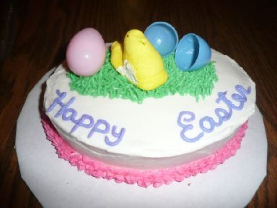 All butter cream. Used oval cake pan. Used a marshmallow peep with two plastic eggs.