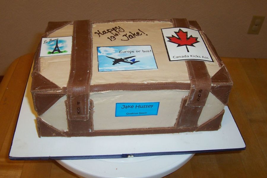 Genoise soaked in Kalhua sugar syrup, then layered and finished in mocha swiss meringue buttercream. The leather accents are Toba's chocolate fondant. I made the "stickers" with clipart images and text printed on regular then attached to freezer paper using double sided tape. This was a blast to make. TFL!