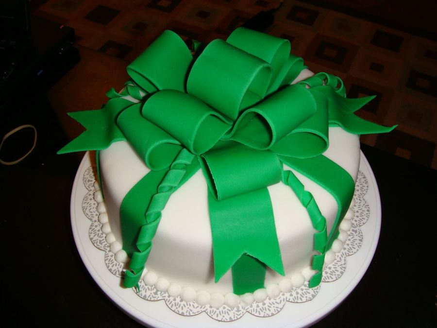 I made this for St. Patrick's Day, it's a white cake dyed green, covered in white fondant with green fondant bow and stripes. I think this is a good design for any occasion though such as a birthday with a different color scheme.