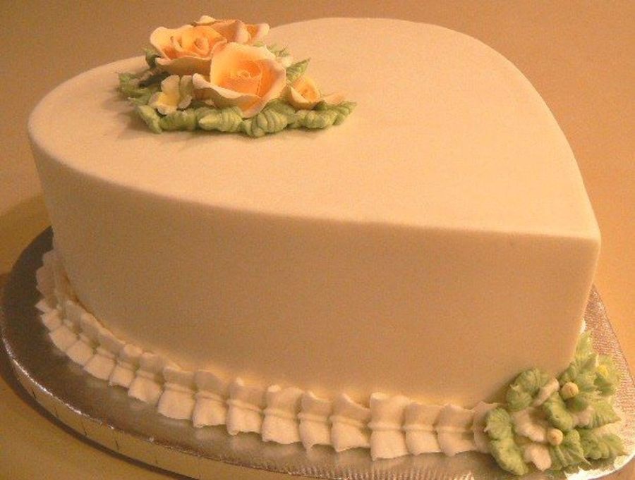 8" heart caramel cake with buttercream filling and icing. Gumpaste roses and filler flowers. Made at the last minute for my mother-in-law who just returned home from a 2-week trip overseas.