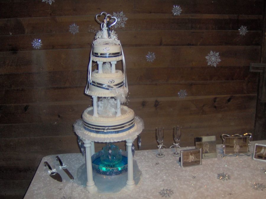 THIS CAKE WAS FOR MY SONS WEDDING. THEY HAD THE WEDDING AT A 100 YEAR OLD LOGCABIN BACK IN THE WOODS IN THE MIDDLE OF DECEMBER. WE DESIGNED THIS OURSSELF USING SNOWFLAKES AND HEARTS WITH BLUE AND SILVER FOR OUR COLORS. WE USED SNOWFLAKE ORNAMENTS FROM THE CHRISTMAS TREE AND RIBBON WITH SNOWFLAKES AROUND FOUNTAIN THAT JUST HAPPENED TO MATCH FROM WALMART. WE DIED THE WATER BLUE . FUN PROJECT!