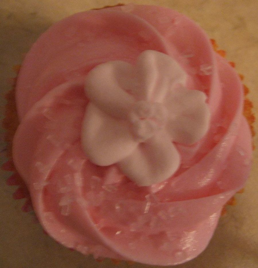 Pink buttercream frosting on vanilla cupcake, pink sugar crystals, with a baby pink royal icing flower on top. I made these for my son's preschool's Easter party. My 1st royal icing flowers.