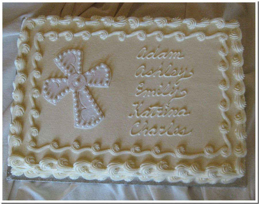 Buttercream with gumpaste cross dusted with pearl dust and decorated with sugar pearls
