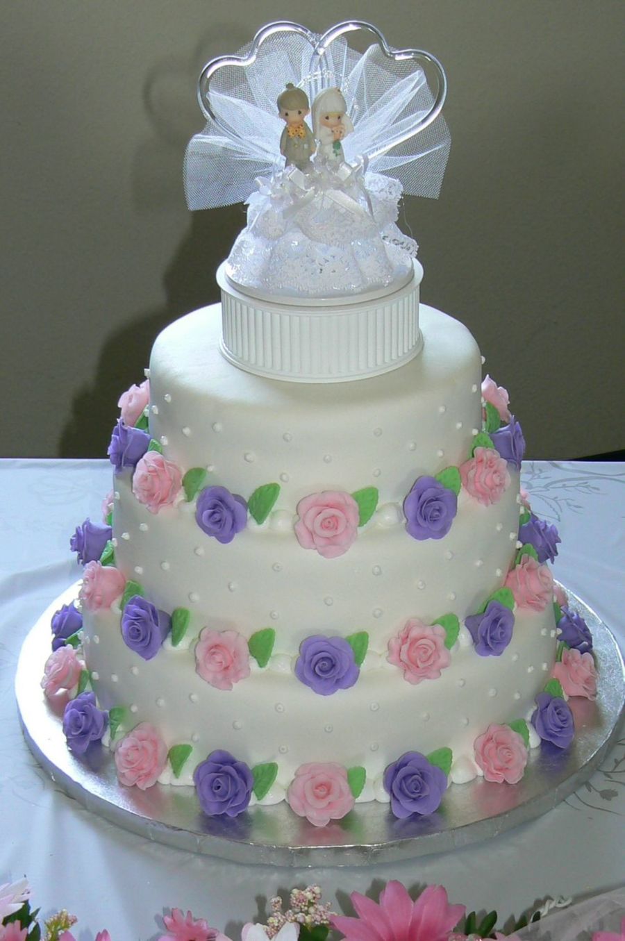 This was a fun spring/easter wedding cake that I did for my cousins wedding the day before easter. This cake is covered in fondant. All roses and leaves are hand made out of fondant. Royal icing dots on the side.