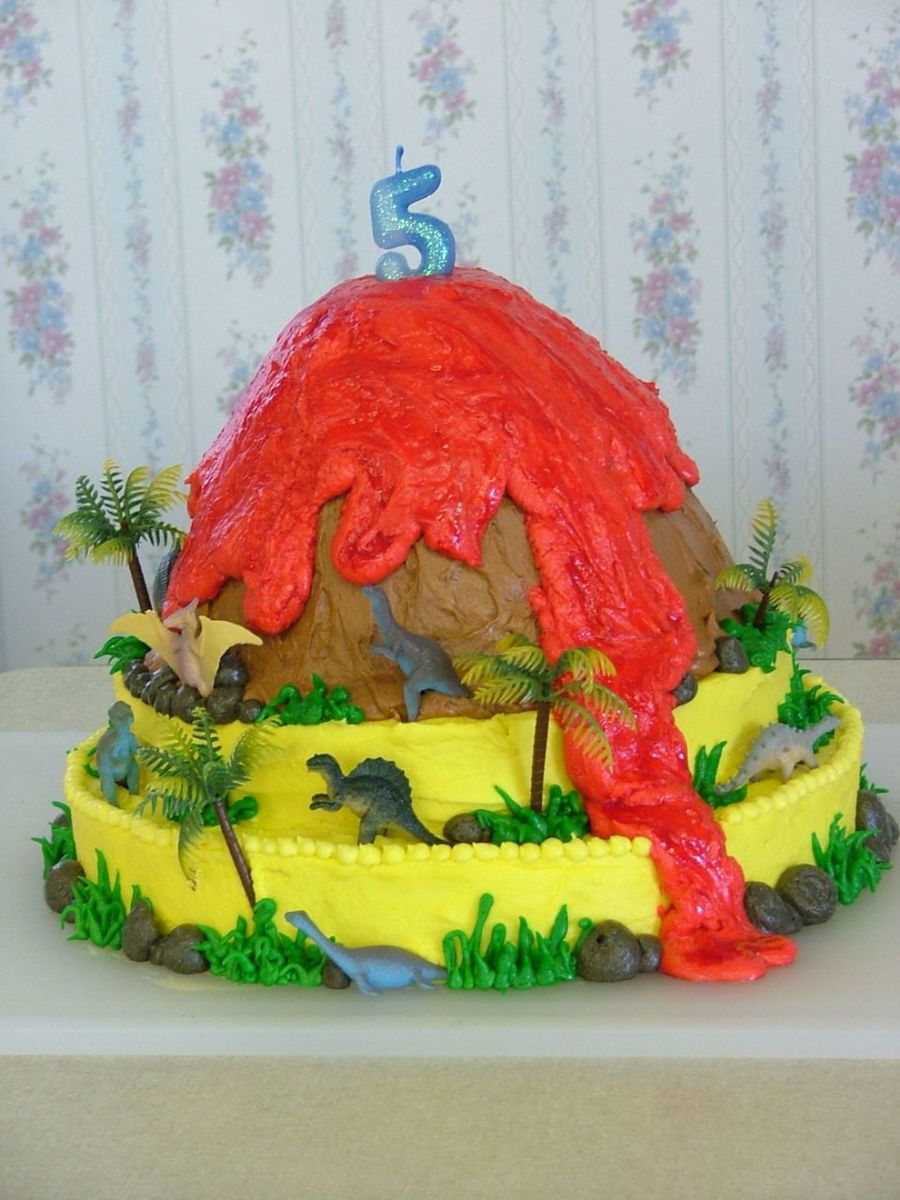 I made this cake for my son's 5th b-day party.. It is completely in buttercream icing with a little tinted piping gel to make the lava pop and some toy dinosaurs for decoration.