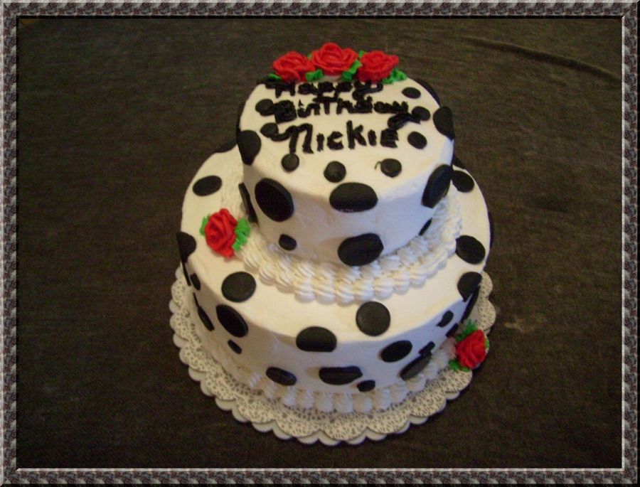 White two tier buttercream with fondant black dots.