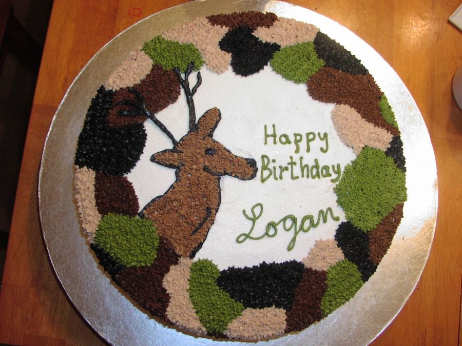 There are so many awesome camo cakes on this website, and I copied ideas from many of them. The deer didn't turn out as well as I had hoped, and I ended up messing up the lettering, but my 8 year old nephew was thrilled with it. I had fun working with these colors. Thanks for looking!