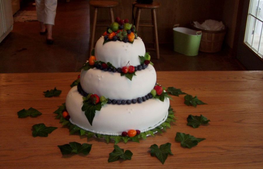 Another family wedding cake. White cake with chocolate mousse filling. Vanilla buttercream covered with fondant.