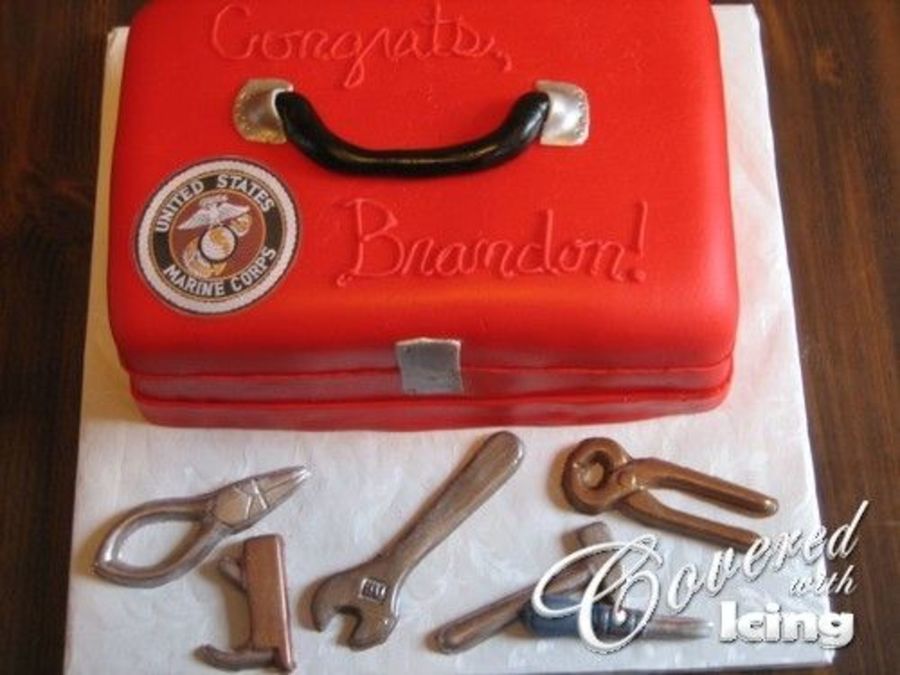 This was a special cake made for a friend's son who had just graduated from basic training. He is going to be an aviation mechanic in the US Marine Corps-Semper Fi!! This was inspired by several toolbox cakes here on CC. The tools are all made of chocolate and brushed with luster dust.