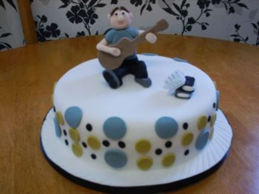 This is a 10" Madeira, covered in fondant with fondant dots. This is my second figurine really enjoyed doing it. I am always stuck for ideas for male cakes but my Son loved it.