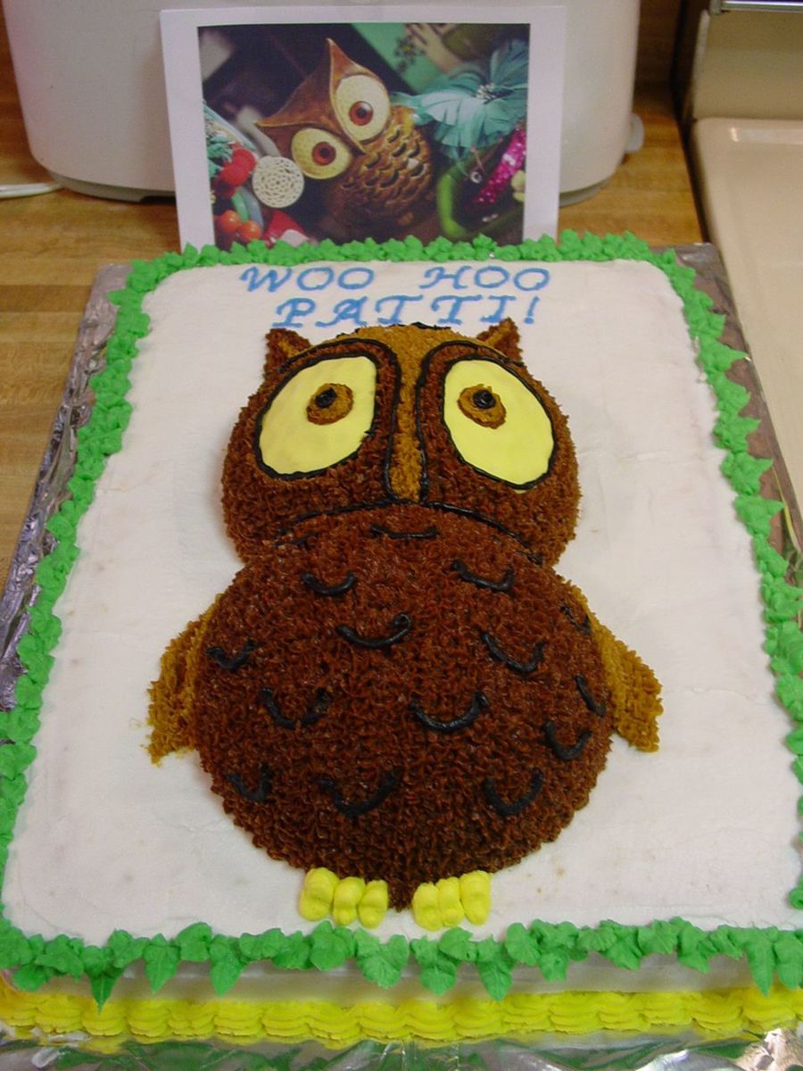 Buttercream with fondant eyes. Made this to celebrate a co-workers end of chemotherapy. Owl is made from "ball" pan.