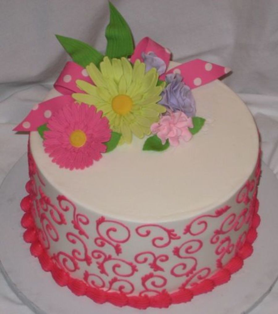 This cake in done in all buttercream. The flowers and bows are all done in gumpaste. This was really my first attempted at a gumpaste floral spray.