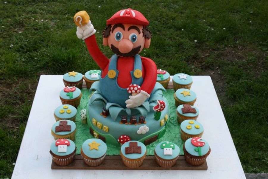 Firstly let me start b saying that the head of mario is a styrofoam ball, covered in fondant! The body is cake baked in a dolly varden tin and then carved to shape. The arms are rolls of fondant.. the raised arm has a chopstick going through it and shoved into side of cake. This wasn't difficult, but time consuming, and I took my time with it,,, . The blue overalls were done in two piees.. front & back, and then placed on cake. Cupcakes were easy!!!