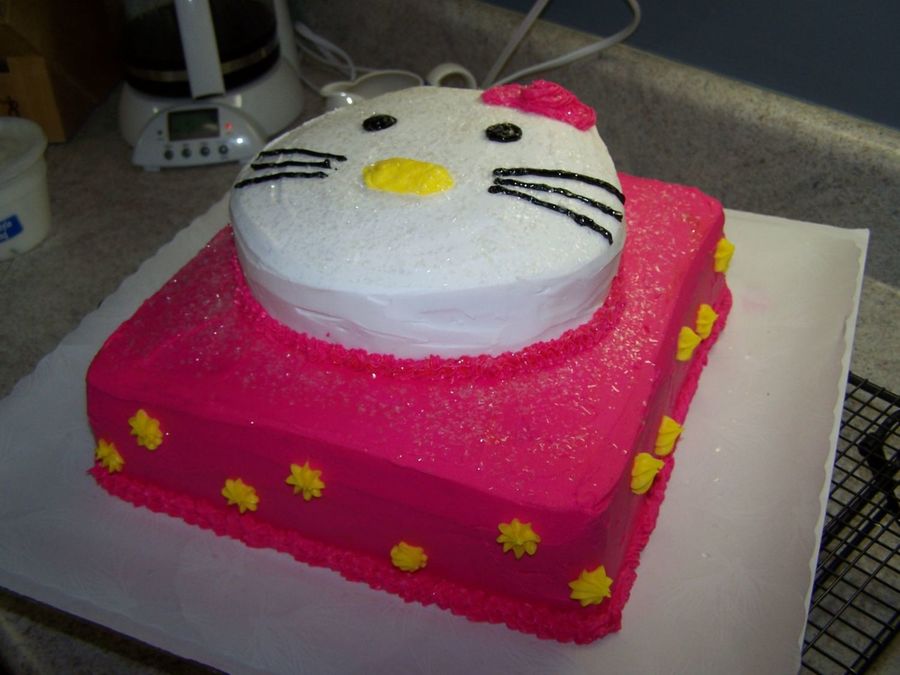 this is my second hello kitty, I love making them! 2 10inch rounds and then I cut the kitty shape out of an 8 inch round! All buttercream icing!