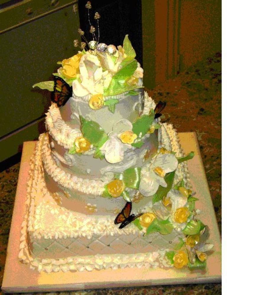 Four tier white wedding cake with white butter cream frosting and gum paste flowers everything editable except butterflies and crystal topper