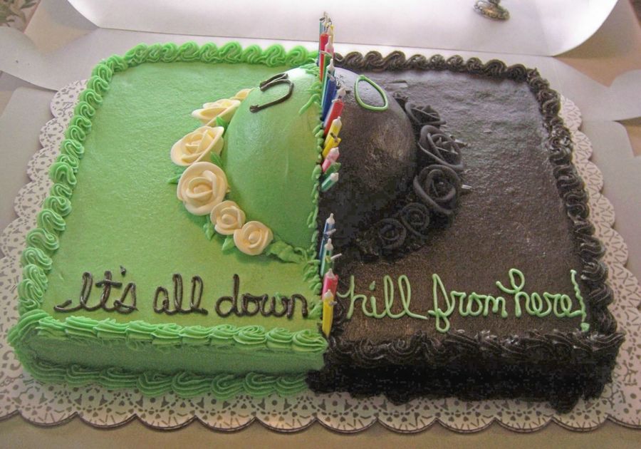 My dh's 30th over the hill cake. Choc./choc. w/BCI. half green w/white roses and half black w/black roses. 30 candles. "It's all down hill from here." I wanted the cake to look ugly but the roses def. made it prettier than I would have liked it to be.