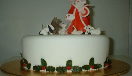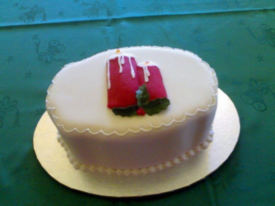 I forgot to take a picture at home, so this was taken with my phone. i made it for some good friends of mine. its a 6" shaped pan, was my 1st attempt at covering a cake like this, and then to do some crimping... agggh what was i thinking, !! I decided to have a go with some built up candles, and holly leaves,when and if theres a next time i now know to do a dot line at the same height around it.. and follow it. and not my eye. LOL