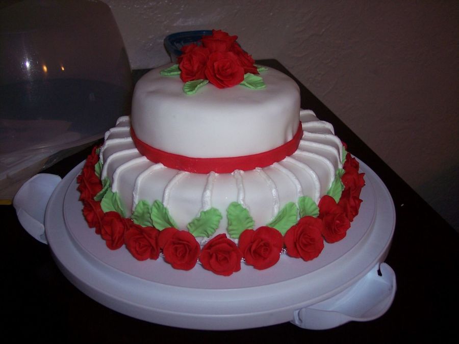 This is my final cake for my wilton class III. My teacher was awesome and let me do what I wanted! I am so proud! Its yellow cake covered in fondant with fondant roses. The strips are done with butter cream, though I probably should have done them in royal. I also covered the strips with pearl cake dust!