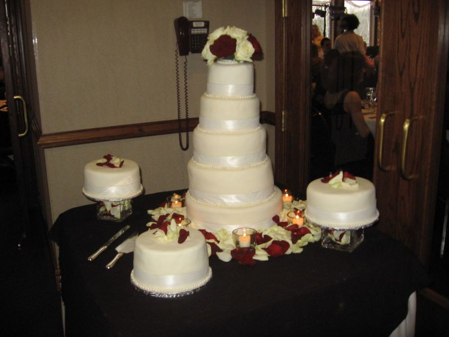 This is my second wedding cake. I made it as a gift for my brother's wedding. It's 14, 12, 10, 8, 6 inch. side cakes are 8in. and elevated on vases filled with real petals It's done with Ivory fondant and ribbon with sugar pearls.