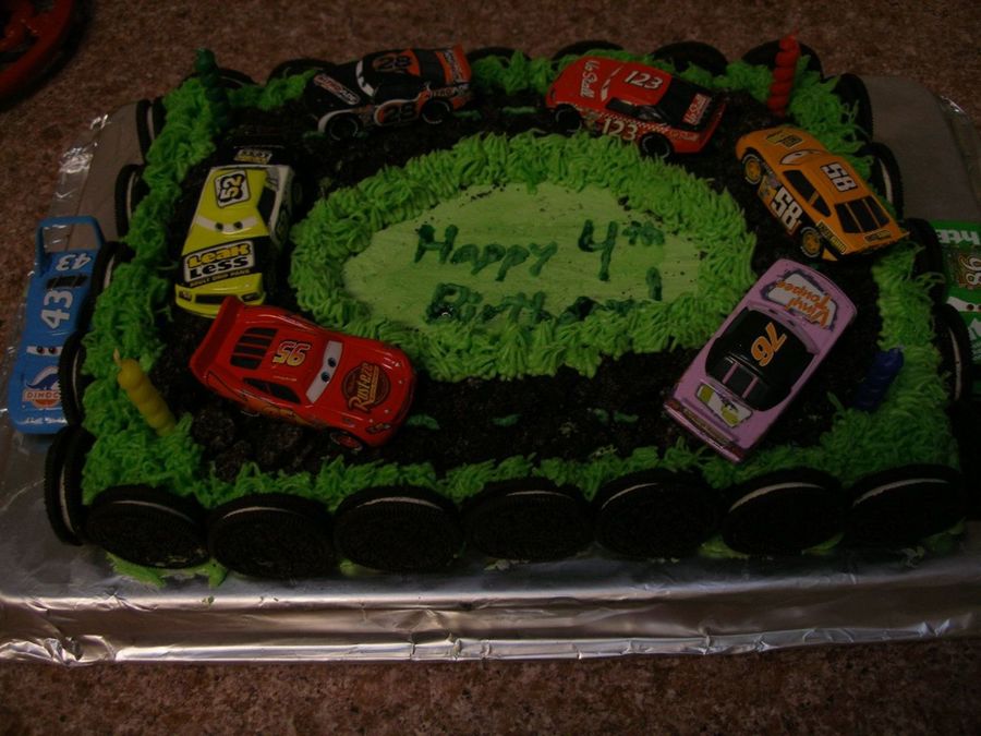 My four year old son wanted cars, cars, and more cars for his birthday cake. The racetrack is made of crushed Oreos and the frosting is homemade buttercream. The cake is chocolate, of course!