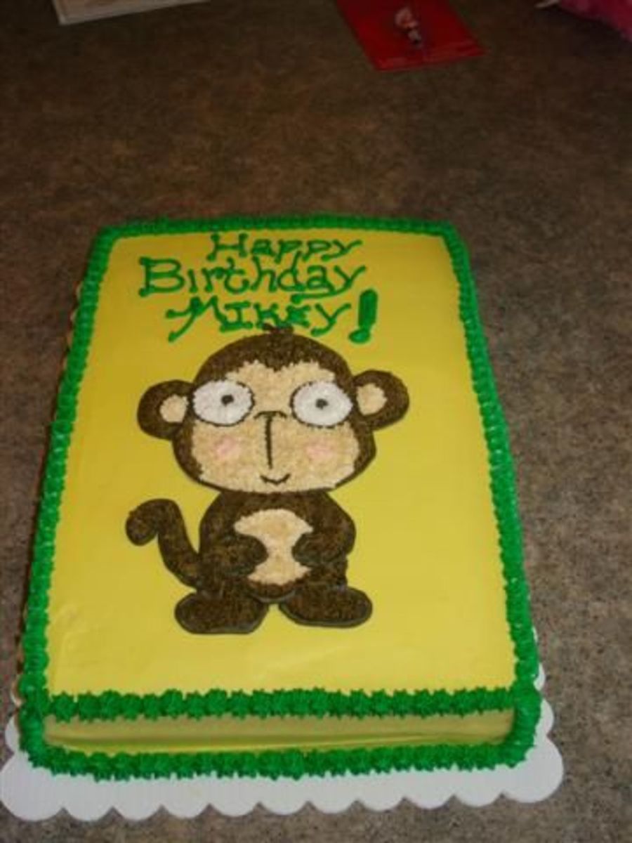 Banana cake with fresh strawberries in layers and strawberry buttercream frosting. This was for my husband's b-day... he loves Monkeys!!!