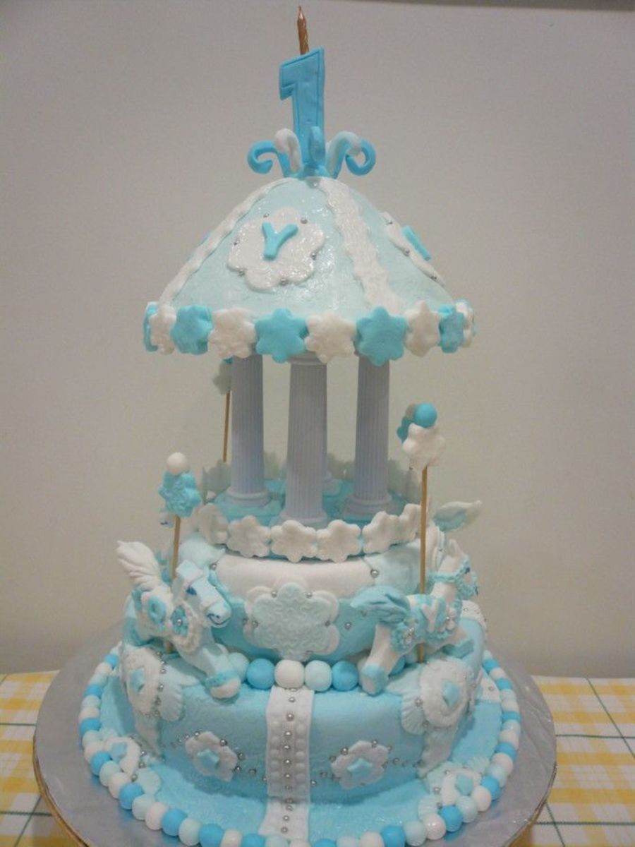Cake was design for an one year old boy. The theme colour for the party is baby blue & white. All figurines were handmade/moulded.