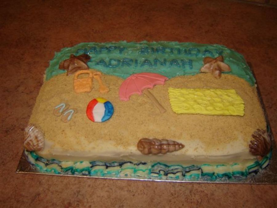 For a co-worker's daughter who was turning 3. 9X13 carrot cake, BC icing, Graham wafer crumb "sand", fondant decorations and Candy Melt shells. It was a quick cake, but my friend really liked it (and my husband loved the flip flops!). The second cake I've ever sold!