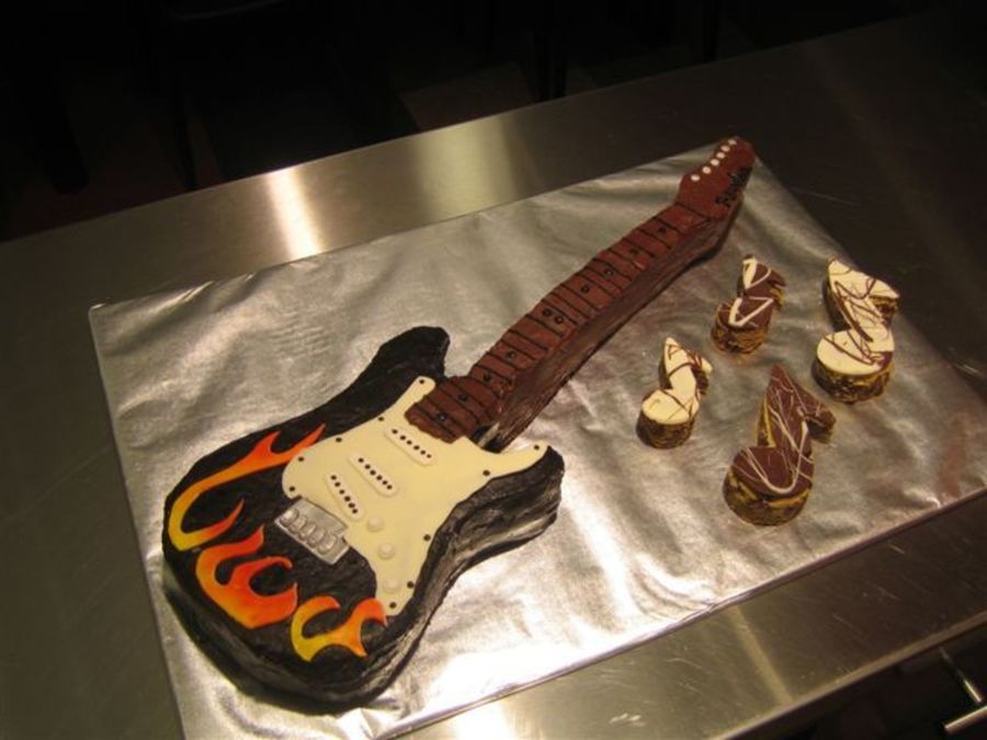 Very nice guitar. Are the notes cookies? Here's a thought for the strings, try using uncookied spaghetti and paint them silver. Much better detail on your cake than mine!