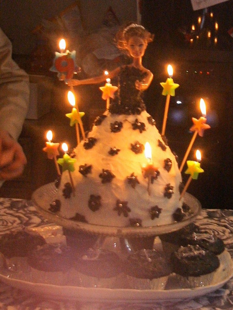 Black and White Barbie cake. Stack 3 regular cakes...top level should be made using a large oven safe glass mixing bowl