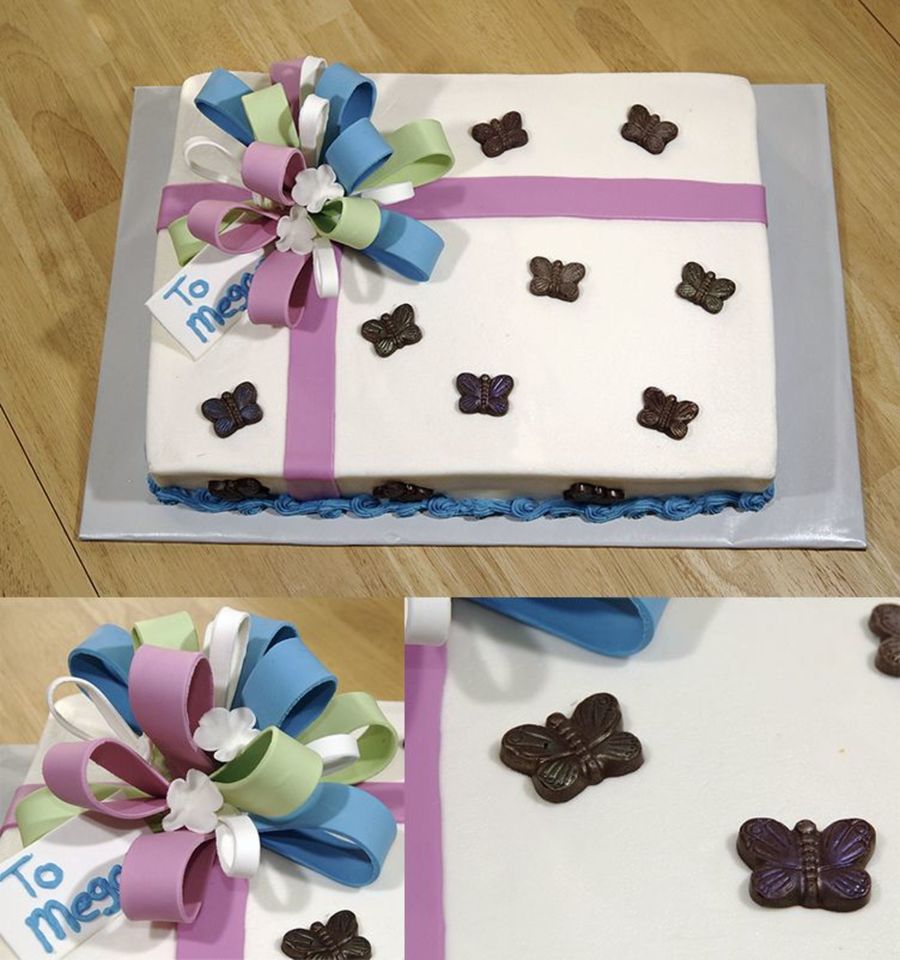talmas on 12 Jun 2006 , 11:32pm Yes, the cake is covered in buttercream. The bow is gumpaste. The butterflies are chocolate. Thanks for looking.