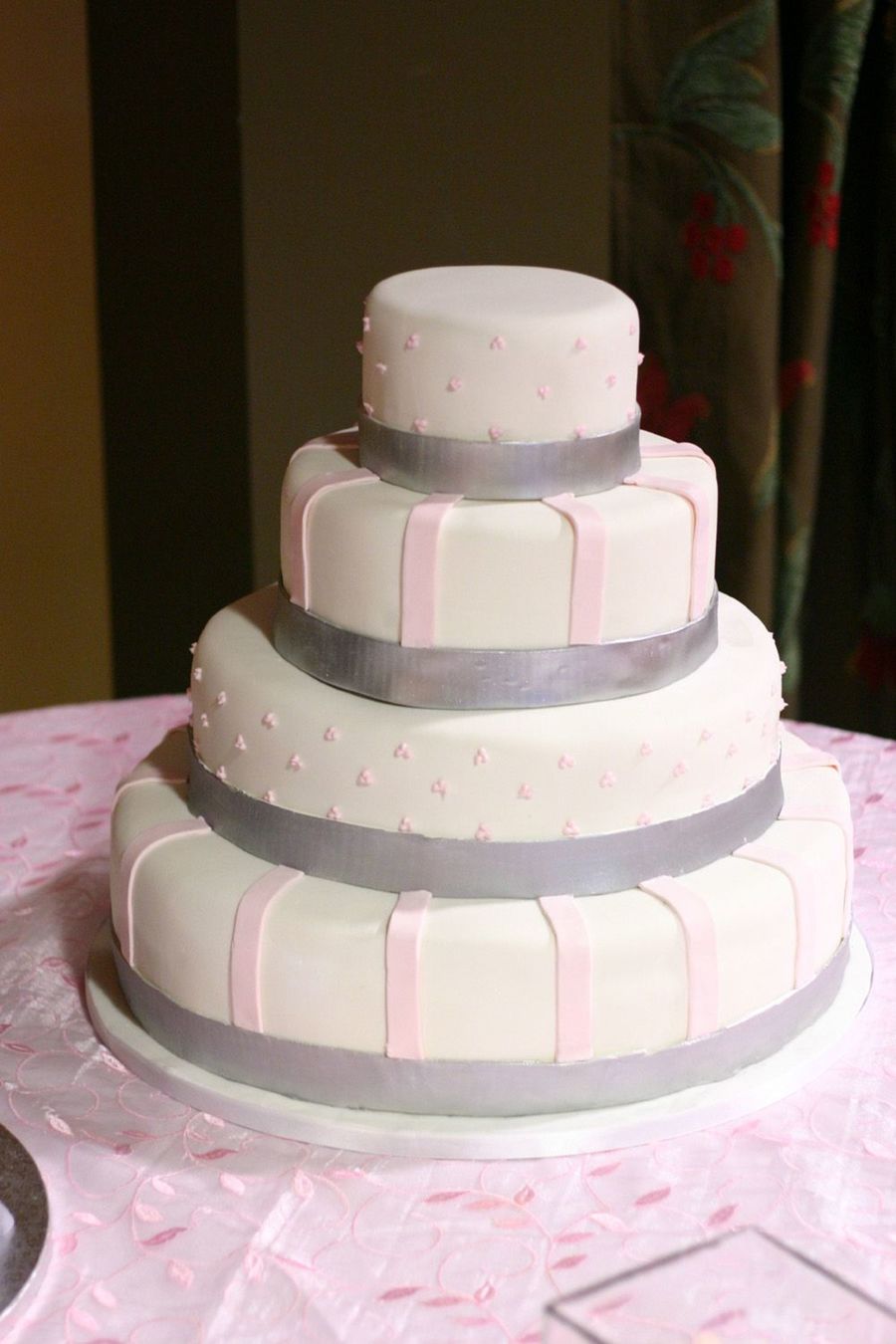 6,10,14,18. my biggest cake yet! iced in white chocolate fondant with silver fondant ribbon (highlighter dust) and pink accents. thanks for looking, all commetns appreciated!