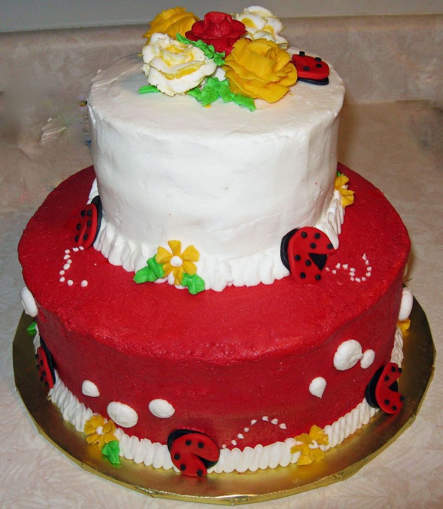 10" chocolate and 6" white cake frosted in buttercream with fondant ladybug accents