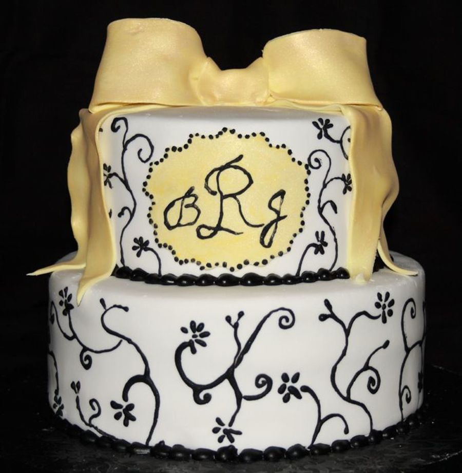 JoanneK on 6 Apr 2008 , 9:36pm Love the yellow with the black and white. Did you pipe the design or is hand drawn? Great job.