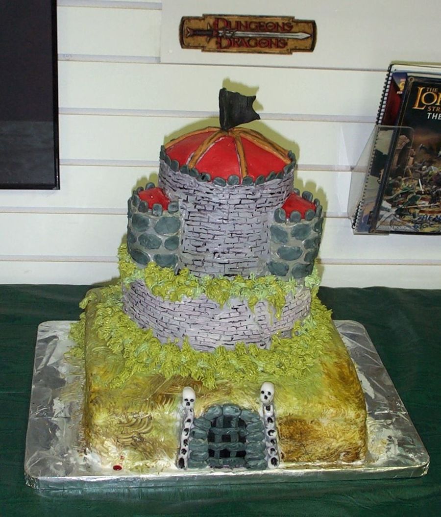 Bottom layer isYellow w/rasberry & lemon.Rest of cake was marble & chocolate w whipped chocolate ganache. All buttercream frosting with painted brickwork over crusted buttercream.Slate stonework is fondant alonf withsckulls ,chains and red turrets. This is a comcination of pictures of models from my neighbors books. He organized a game competition ..this was thier dessert.It was fun to make and experiment with different textures and colors.